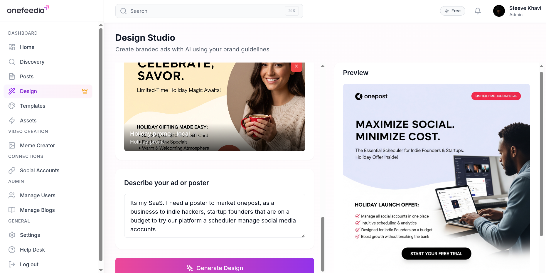 From brand setup to final ad in minutes. Watch how our AI transforms your ideas into professional designs.